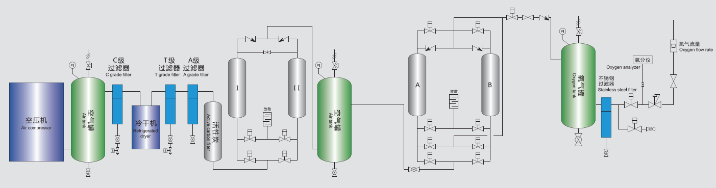 Das Prinzip der Druckwechseladsorption besteht in der Verwendung der Auswahladsorptionseigenschaften von Zeolith-Molekularsieben, der Verwendung von Druckadsorption und einem Vakuumdesorptionszyklus, sodass Druckluft abwechselnd in den Adsorptionsturm gelangt, um eine Lufttrennung zu erreichen und kontinuierlich hochreinen Produktsauerstoff zu erzeugen.